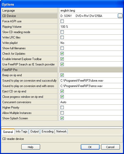 Now if you have more than one CD player attached to your computer, you probably want to go back to General page and check whether the right player is selected on CD Device line. If it is not, select the line and again click on the three dots button at the right to change it.